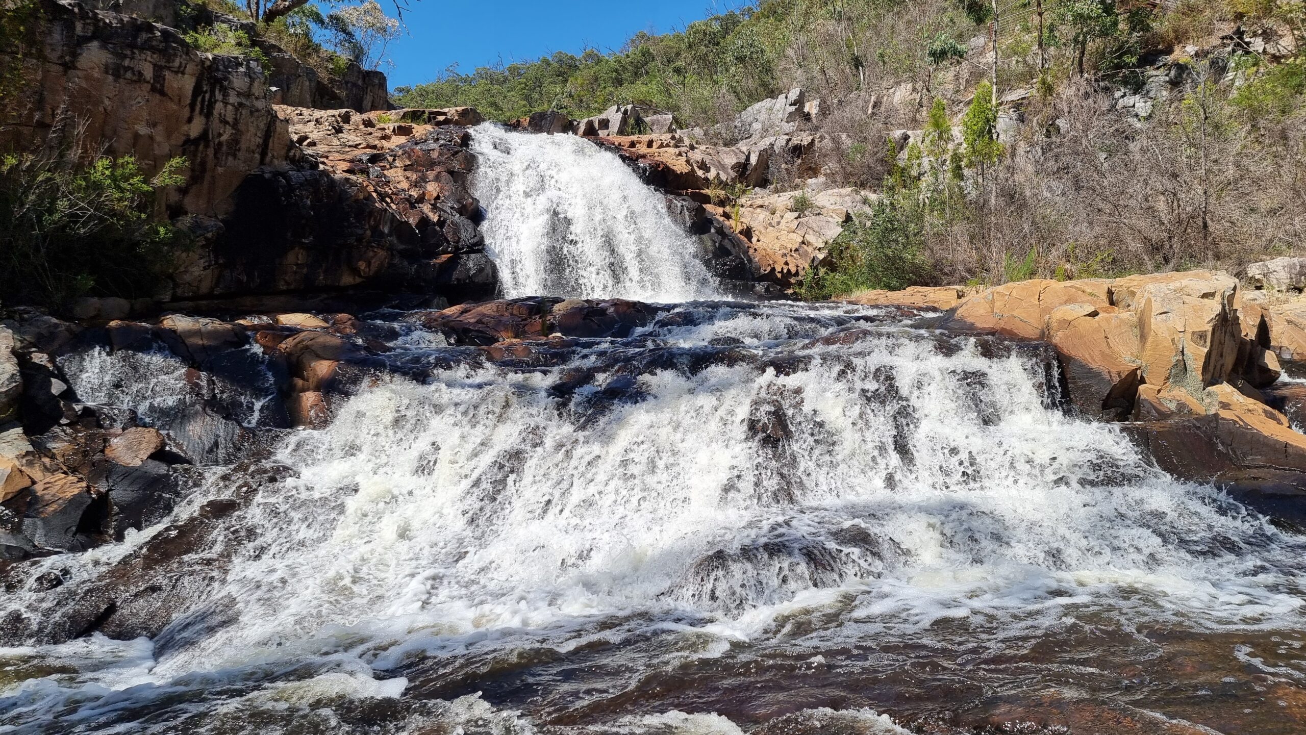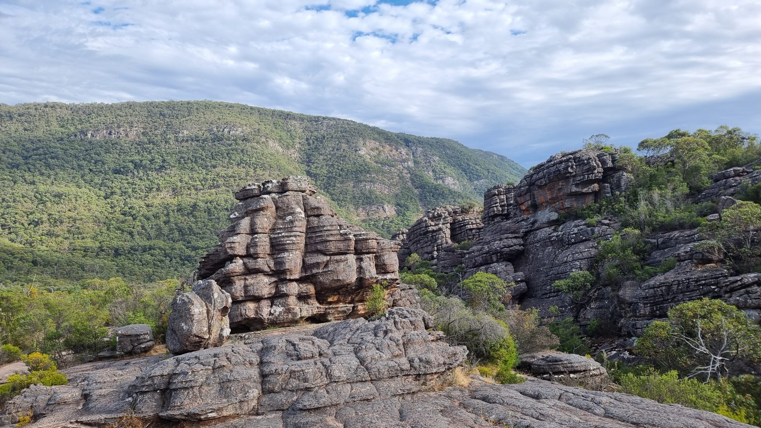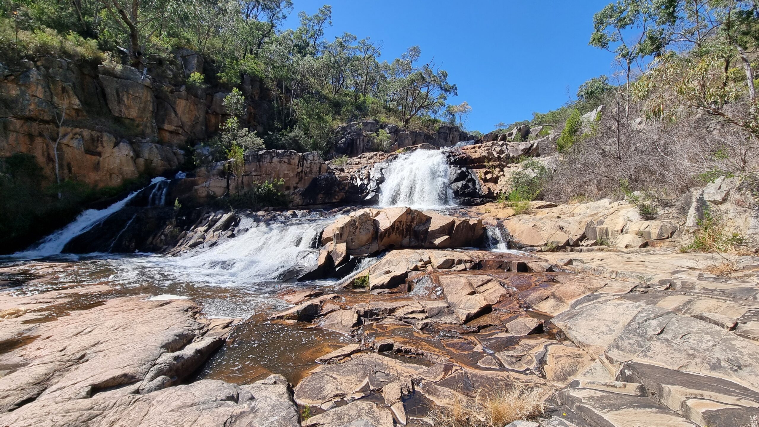 Unser Ziel Halls Gap war schon in greifbarer Nähe. Es liegt im Grampians National Park und soll uns mit einigen Highlights überraschen. Ein touristisches Dorf für Wanderer, Velofahrer, Hiker und noch viel mehr. Unser Campground versprach uns viel Wildlife und so war es auch. Die Gelbhaubenkakadus waren unsere ersten Besucher, dann kamen die Sittiche, die Braunkopfenten und zum krönenden Abschluss die eastern grey Kangaroo. Nachts wenn wir raus mussten, liefen wir Slalom um sie herum zum Klo… Es war einfach toll, all die Tiere so hautnah zu erleben. Wir waren aber nicht nur im Campground, sondern erklommen am ersten Tag die Pinnacles. Wir starteten bei ca 400m ü.M und waren oben auf ca 700m ü.M. Zum guten Glück war es an diesem Tag bewölkt, sonst wäre dies eine noch grössere Schwitztour geworden. Der Ausblick oben hat uns aber überaus belohnt. Am zweiten Tag ging es etwas gemächlicher dem McKenzie River entlang, aber es war drückend schwül. Wir bewunderten die Fish Falls und auch weiter oben dann die McKenzie Falls. Zurück im Campground wurde dann relaxt, viel getrunken und besonders mit Wassermelone den Durst gelöscht